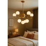 This Modern Globe Orbit Chandelier features a striking arrangement of spherical lights encircled by orbit-like rings. Its geometric form adds depth and visual interest, making it an eye-catching centerpiece for any interior. Ideal for dining rooms, living areas, or entryways, it combines light and structure in a bold display.